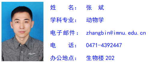 张斌,男,汉族,生于1979年,祖籍辽宁康平,理学博士,教授,博士生导师。beat365唯一官方网站副院长,内蒙古自治区动物学会副理事长,内蒙古自治区“草原英才”。先后入选内蒙古自治区“青年创新人才”一层次、内蒙古高等学校“科技领军人才”。研究领域包括动物系统进化、干旱区环境与动物演化、有害生物防控、媒介生物学与病原控制等。主持国家重点研发计划课题1项、国家科技部基础资源调查专项课题共1项、国家自然科学基金项目3项、省部级科研项目10余项。发表研究论文70余篇,SCI收录40篇,出版学术著作4部。