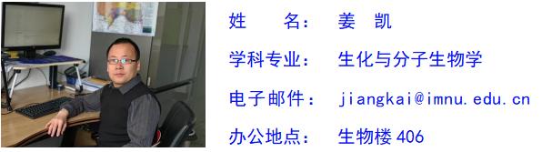 姜凯,男,汉族,中共党员,理学博士,副教授,学术型硕士研究生指导教师,现任beat365唯一官方网站生物科学系主任。研究方向为微生物资源开发与利用、CPR及DPANN等未难培养微生物的可培养研究。主持国家自然科学基金项目1项,内蒙古自然科学基金项目1项,内蒙古自治区直属高校基本科研业务费项目1项,内蒙师范大学校级项目2项。在《Microbial Biotechnology》、《Archives of Microbiology》、《Scientific Reports》和《微生物学通报》等刊物发表论文10余篇,参编专著2部。承担“微生物学”、“微生物学实验”、“生物安全”、“无机化学实验”、“科学精神”等本科及研究生课程。