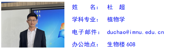 杜超,男,汉族,群众,博士,讲师,硕士研究生导师,生物技术系副主任,主要研究方向为植物逆境生理及分子生物学。主持内蒙古自然科学基金项目2项,内蒙古自治区直属高校基本科研业务费项目1项;参与国家自然科学基金项目3项,内蒙古自然科学基金项目2项。发表学术论文13篇、专利1项,获beat365唯一官方网站青年教师教学技能大赛一等奖、内蒙古自治区高等院校青年教师教学技能比赛一等奖。承担普通生物学、种子植物分类学、植物学实验、植物学实习、生物分类学实习、植物生物学、科学伦理、学术诚信和学术规范等本科生及研究生课程。